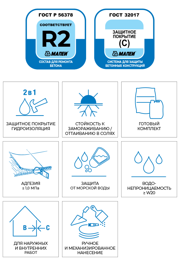 Двухкомпонентная полимерцементная смесь для защиты и гидроизоляции бетонных и железобетонных конструкций.