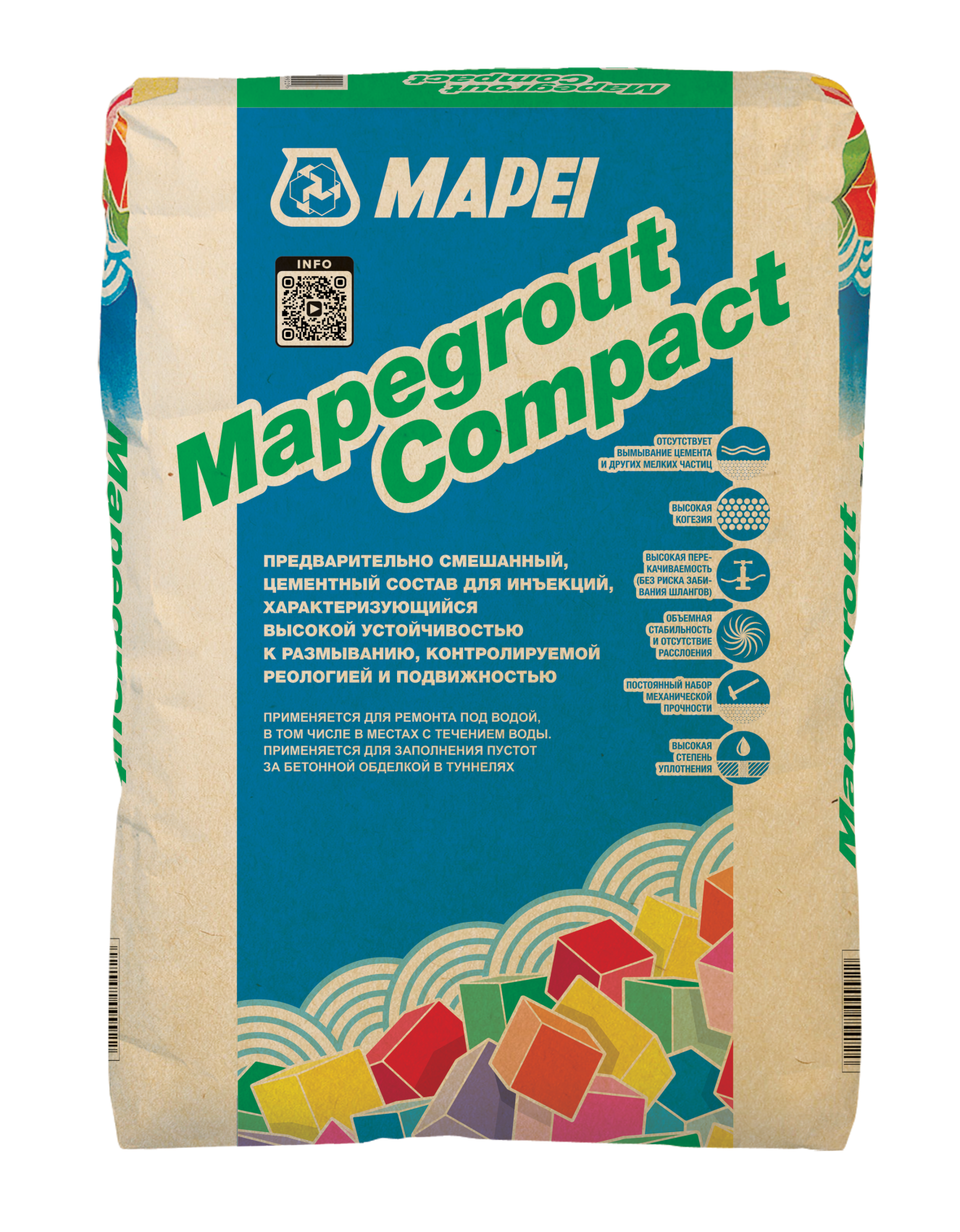 После смешивания с водой особые компоненты Mapegrout Compact придают материала очень высокую когезию и устойчивость к размывающему воздействию воды, даже под давлением.