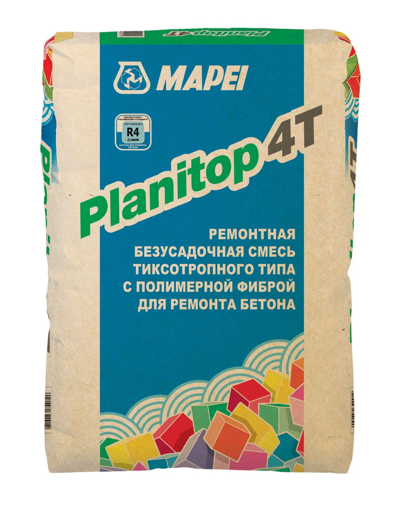 Planitop 4T – готовая к применению сухая ремонтная смесь на цементной основе, содержит полимерный фибронаполнитель. При смешивании с водой образует не расслаивающуюся растворную смесь, обладающую тиксотропными свойствами, что позволяет её использовать на вертикальных и потолочных поверхностях без опалубки.