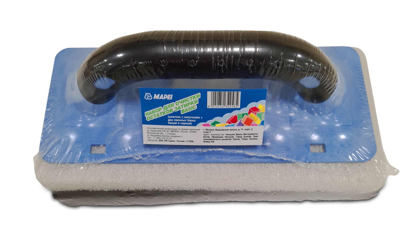 Включает в себя шпатель с липучками и два сменных блока (белый и черный)
