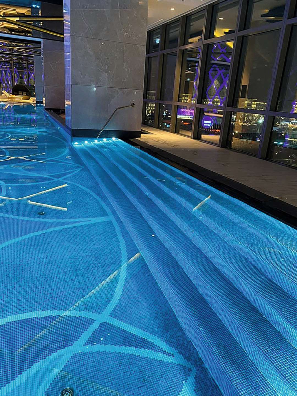 Укладку мозаики в бассейнах произвели при помощи улучшенного клея на цементной основе класса С2ТЕ Adesilex P7 белого цвета. Для затирки межплиточных швов в зонах общего пользования использовали цементно-полимерную затирку Ultracolor Plus.